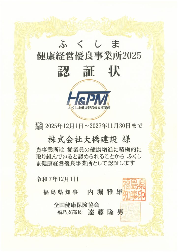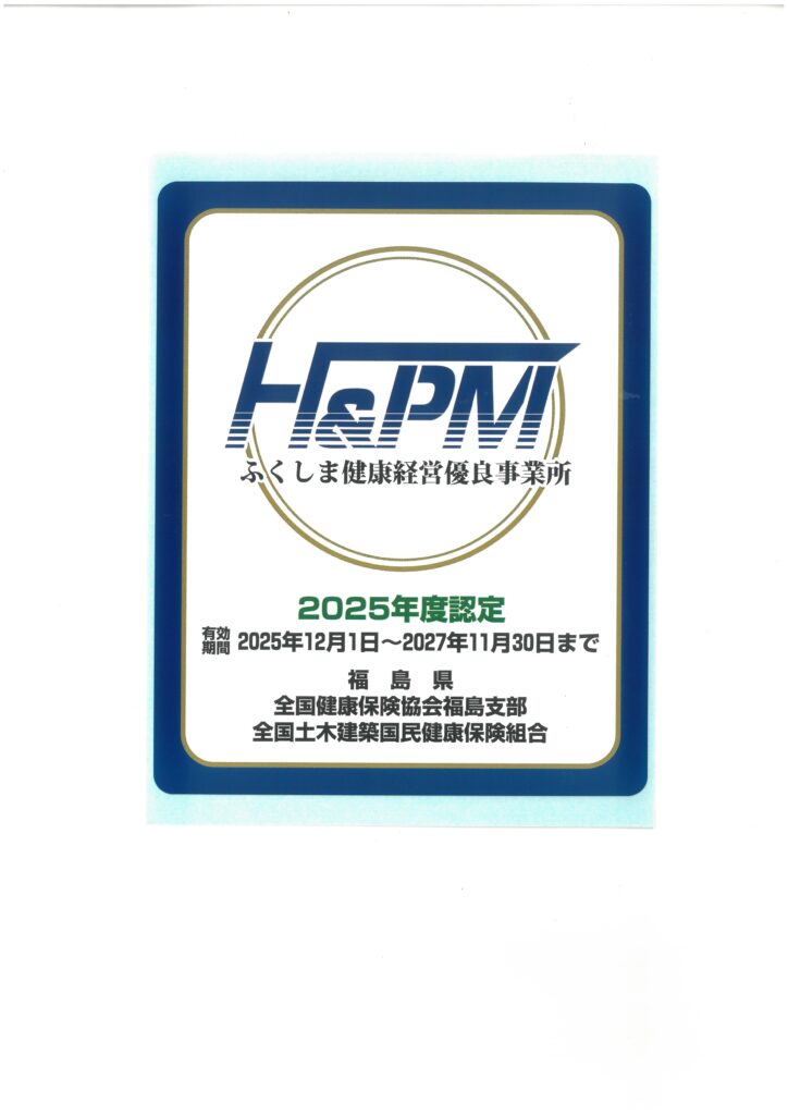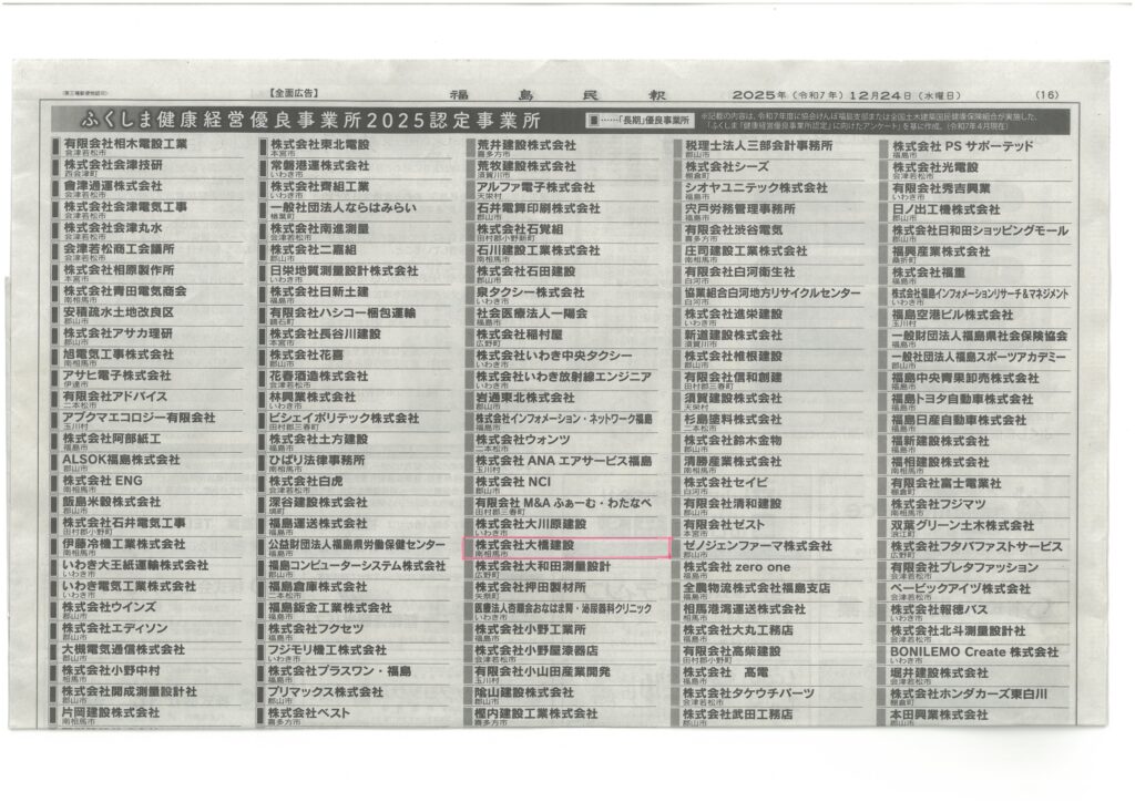 「ふくしま健康経営優良事業所2025」に初認定されました。 2025年12月19日 お知らせ 「ふくしま健康経営優良事業所2025」に初めて認定されました。 今後も社員の健康意識の向上と健康管理に努め、認定企業として一層精進してまいります。 福島民報に掲載されました chevron_left前へ 治山施設(県営)0601工事 東畑地区 施工 chevron_right次へ 2026(令和8)年 新春のご挨拶